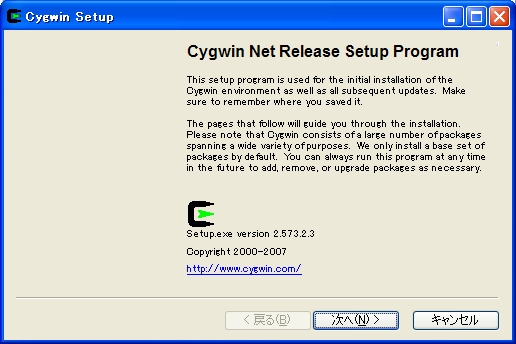 Step 3. Cygwinセットプログラムが起動したら、「次へ」をクリックしてください。