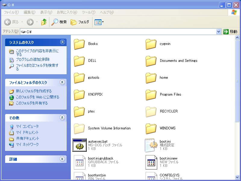 Step 1. アンインストールを開始します。「マイコンピュータ」を開き、「Cドライブ」を開いてください(ココをクリック)。その中の「cygwin」ディレクトリを削除してください。また、インストールのStep 12で「autoexec.bat」ファイルに追記した2行を削除してください。