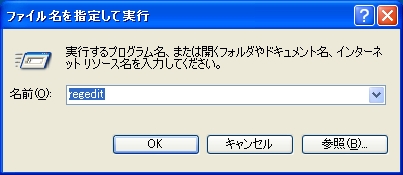 Step 3. レジストリの削除を行います。「スタート」メニューから「ファイル名を指定して実行」を選択してください。「名前」の欄に「regedit」と入力してください。「OK」ボタンを押すとレジストリエディタが起動します。