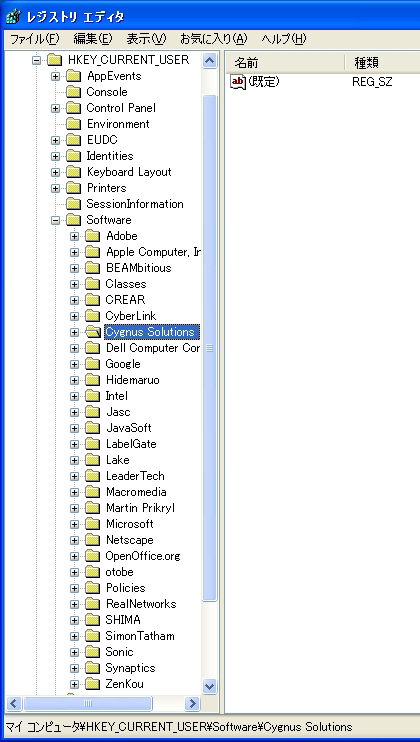 上部の「編集」メニューから「検索」を選択し、「検索する値」の欄に「cygnus」と入力し、検索を実行してください。「Cygnus Solutions」というディレクトリが見つかるので、このディレクトリを削除してください。さらに、上部の「編集」メニューから「次を検索」を選択し、「Cygnus Solutions」というディレクトリを見つけ削除してください。「Cygnus Solutions」というディレクトリが見つからなくなるまで繰り返します(たぶん2ヶ所だけだと思います)。